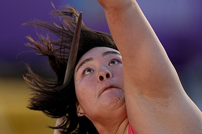 Japan's Haruka Kitaguchi is in action during women's javelin throw final of the World Athletics Championship at National Athletics Center in Budapest on Aug. 25. (Reuters)