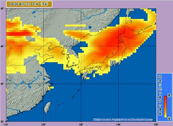 According to the JMA, by 9 a.m. on April 17, yellow sand had been observed at monitoring sites in seven cities: Osaka, Kobe, Hiroshima, Tottori, Takamatsu, Matsuyama, and Shimonoseki in Yamaguchi Prefecture.