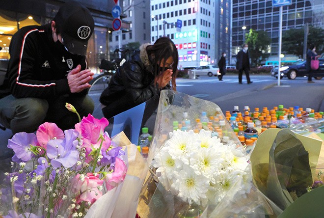 The Asahi Shimbun obtained video from a camera in front of the station which shows a middle-aged bearded man wearing glasses standing near the crime scene at 7:48 p.m. He then walks away before again stopping and moving his hands.