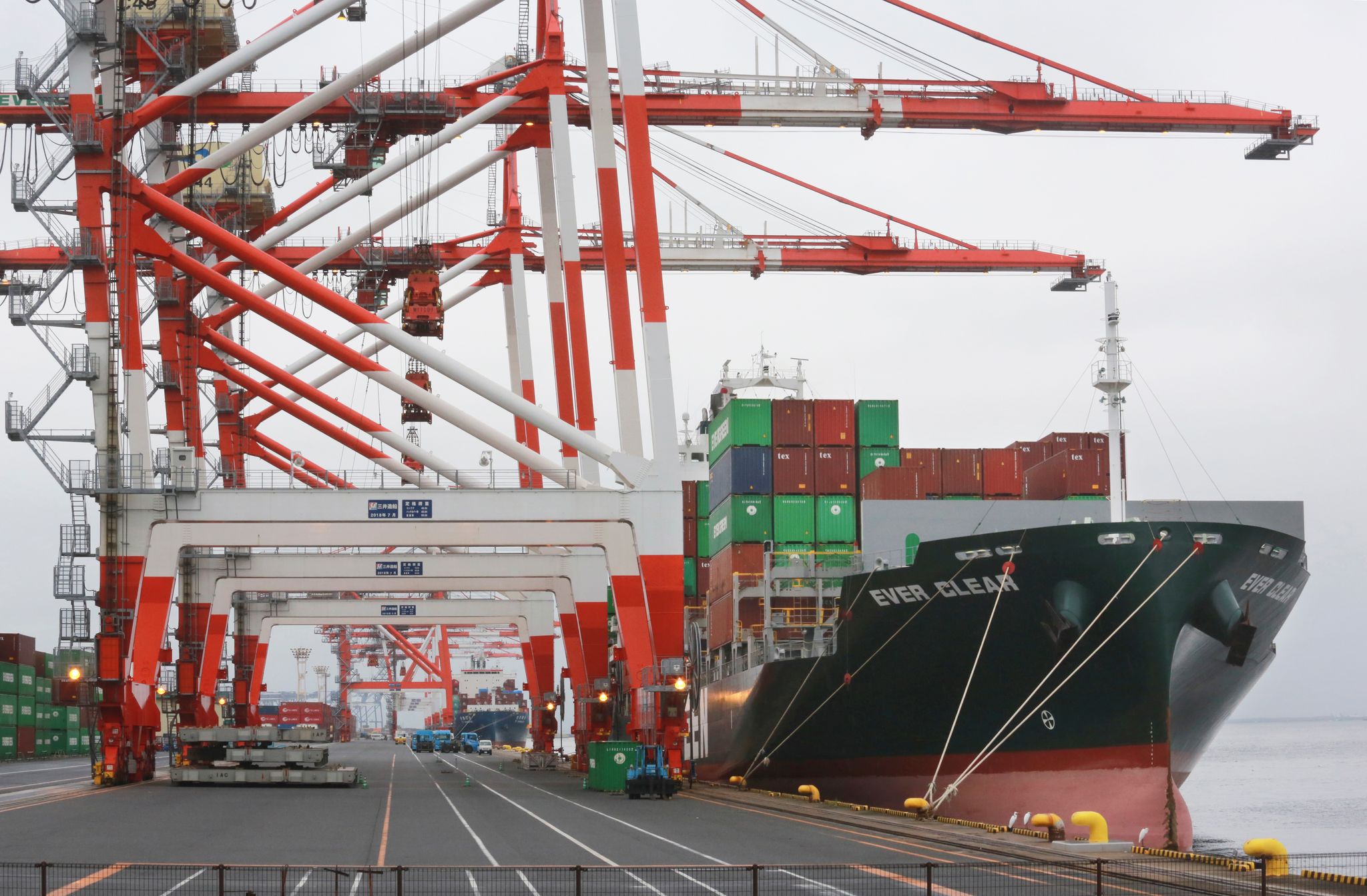 A container ship is loaded and unloaded at a container terminal at a port of Kawasaki near Tokyo on March 9, 2022. (AP Photo)