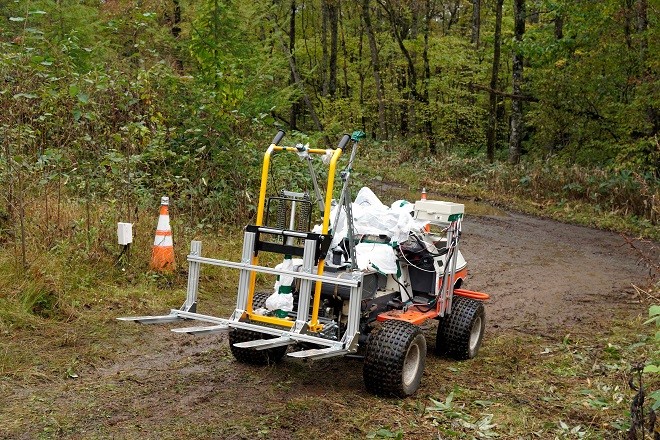 One was a commercially available mini excavator, which was modified for remote operation. The other was a transport vehicle designed to carry the mannequin.