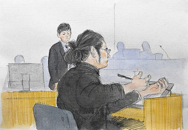 Tetsuya Yamagami apologizes during questioning at the Nara District Court on Dec. 4. (Illustration by Eri Iwasaki)